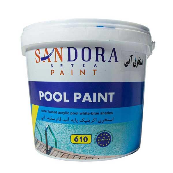 رنگ اکریلیک استخری ساندورا کد ۶۱۰ یک رنگ مقاوم در برابر آب است و برای رنگ آمیزی استخرهای شنا و سطوح سیمانی استفاده می شود. این رنگ جزو رنگ های پایه آب اکریلیک دسته بندی می شود و ظاهری زیبا و مات ایجاد می کند. رنگ های استخری در دو رنگ آبی و سفید در بازار یافت می شوند.